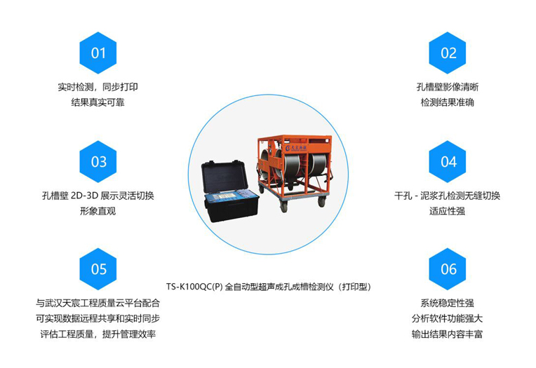 武汉天宸自2013年推出第一代全自动型TS-K100/K160型超声成孔成槽检测仪以来,产品不断创新升级,逐渐推出了第二代全自动TS-K100QC(B)型,第三代同步检测孔径沉渣的多功能TS-K100DC(B)型,第四代集成无线传输,实时链接云平台,实现数据远程共享和结果远程评估的无线全自动TS-K100QC(W)型,此次在天津地铁四号线再立新功的是第五代现场同步打印的TS-K100QC(P)型