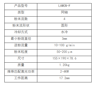 同轴四点式喷嘴相比于同轴环形、三点式喷嘴粉斑焦点更大,工作距离更远,配合大功率、大光斑激光可以实现更高熔覆效率,而且可靠性更高,因此更加适合大型工件修复和表面强化。推荐匹配激光功率
