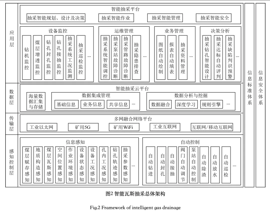 从统筹性、先进性、开放性、适用性等角度综合考虑,设计智能瓦斯抽采的整体架构如图2所示,总体概括为“4层面+2体系”,其中“4层面”包括感知控制层、传输层、数据层、应用层;“2体系”分别为信息标准体系和信息安全体系。各部分既相对独立,又彼此关联、相互依托,形成有机的整体。